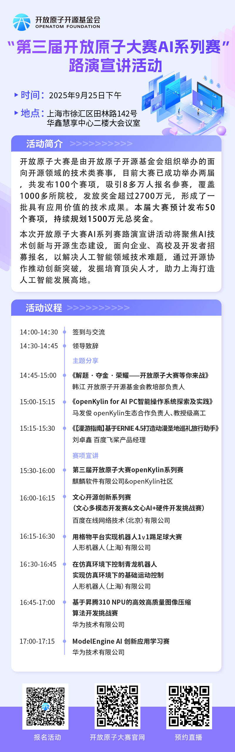 9月25日,由开放原子开源基金会主办,上海市人工智能行业协会承办,仪智空间协办的“第三届开放原子大赛AI系列赛”路演宣讲活动将在上海市徐汇区举办。 活动聚焦人工智能技术攻坚与开源生态建设,邀请来自大模型、基础软件及机器人领域的专家,带来赛题解析与技术分享。